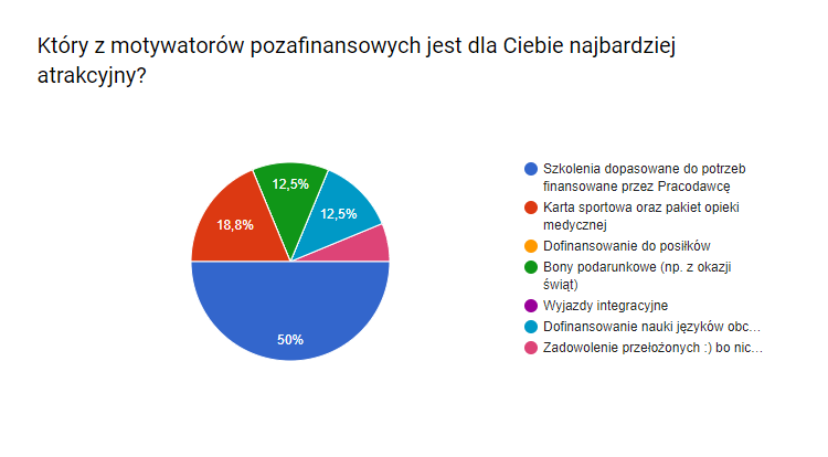 Bardzo wysoko ocenionym motywatorem pozafinansowym były szkolenia opłacane przez pracodawcę. Aż 50% osób określiło możliwość rozwoju zawodowego i zdobywania wiedzy, jako najlepszy motywator. To bardzo istotna kwestia, na którą chciałabym zwrócić uwagę, bowiem nadal pokutuje przekonanie, że pracownik powinien uczyć się sam. A pracownik administracji to już w ogóle samodzielnie. Dla potwierdzenia tej tezy, w innej ankiecie asystentki jasno wskazały, że aby się szkolić muszą robić to w weekendy i finansować z własnej kieszeni.